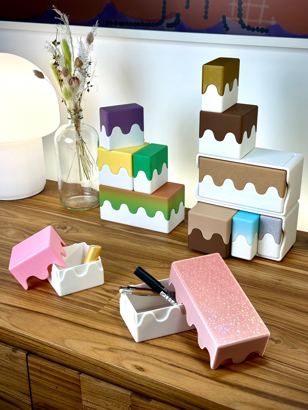 Vi presenterar Wavy Boxes , ett mångsidigt set med tre stapelbara förvaringslådor i storlekarna små, medelstora och stora. Dessa lådor är perfekta för att organisera ditt skrivbord, hobbybord, kryddhylla i köket eller entrén, vilket ger dig oändliga förvaringsmöjligheter.