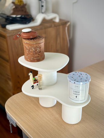 Denna moderna vågiga hylla är idealisk för din skrivbordsuppsättning eller heminredning. Använd detta eleganta stativ för att organisera småsaker eller visa dekorativa element. Den unika designen och den roterande toppen skapar ett modernt och mångsidigt accentstycke för ditt hem.