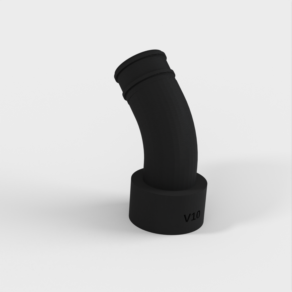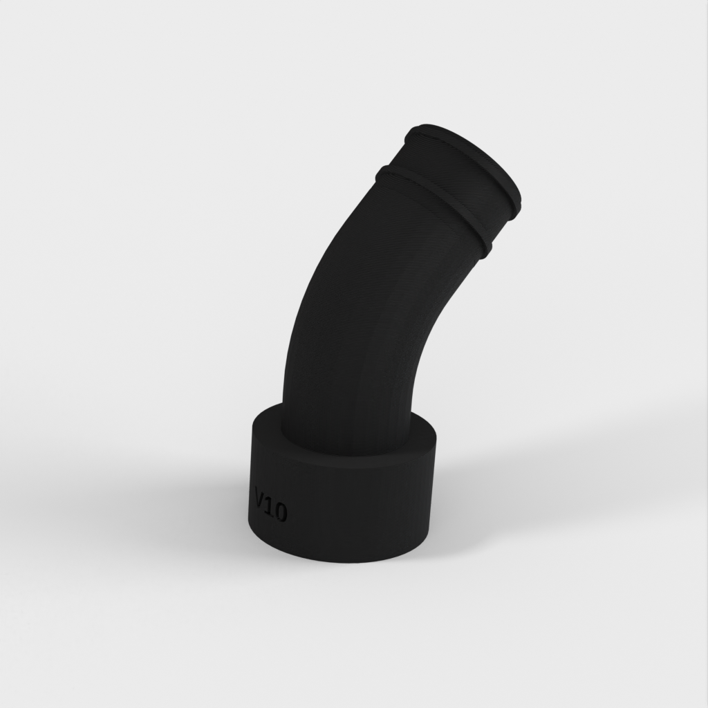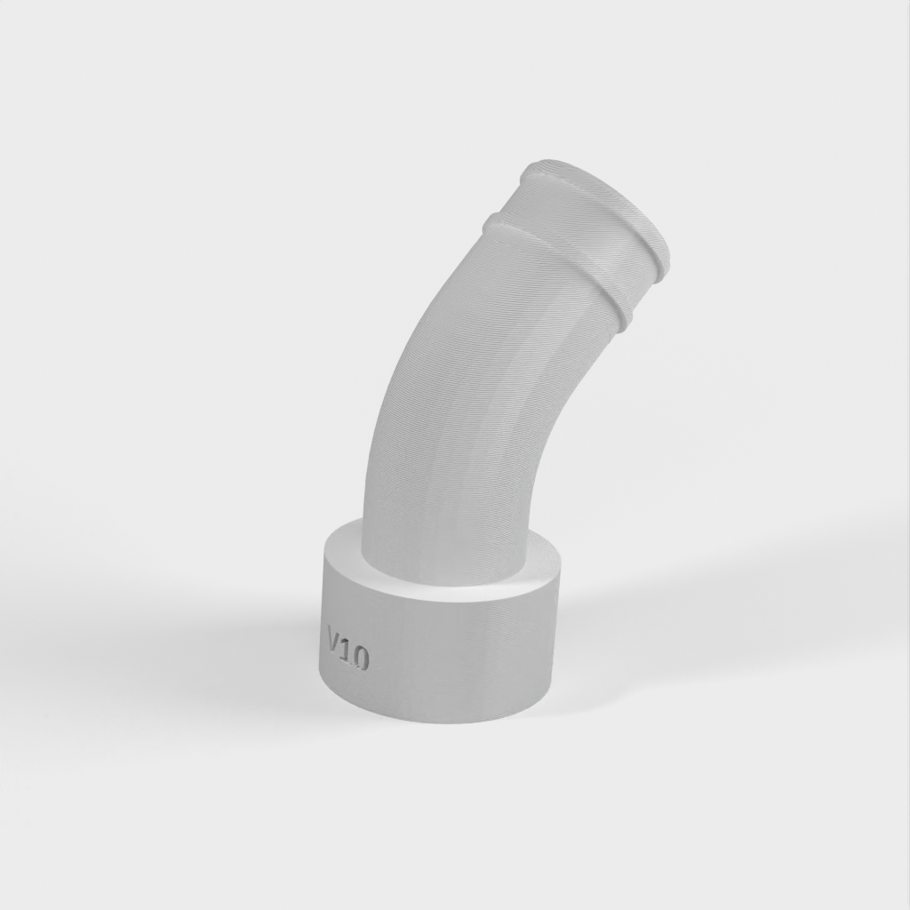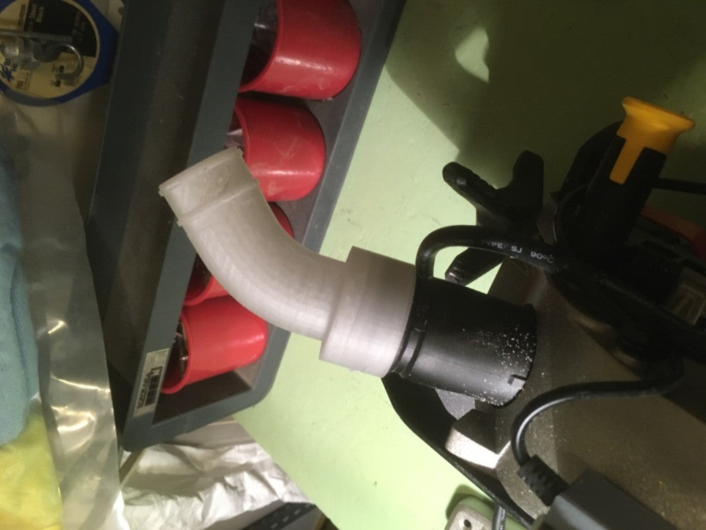 Vid senare användning av kopplingen upptäckte jag att ett problem kunde uppstå om det inte fanns tillräckligt med utrymme bakom sågen för den stela delen av vakuumslangen. För att lösa detta designade jag om den med en böj så att den kan passa direkt till den flexibla slangen som går förbi den stela delen.