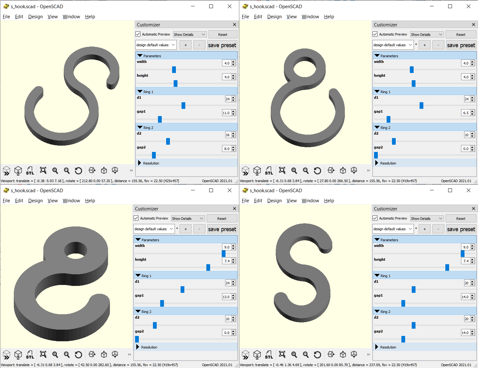Anpassningsbara OpenSCAD S-krokar för badrum och kök