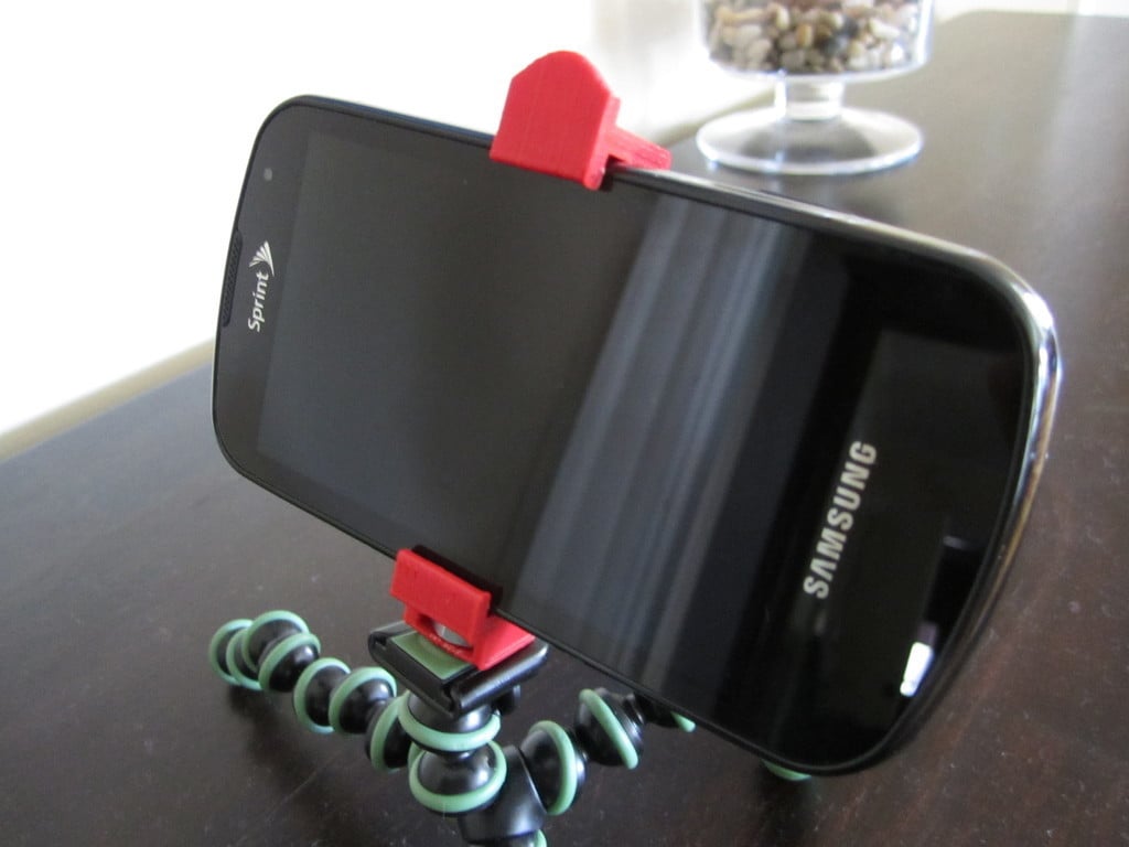 Telefonstativfästet är en universell design som gör att du kan montera din telefon på vilket stativ som helst, inklusive gorillapod. Den använder en standard 1/4-20 mutter för att säkra telefonens position på stativet.