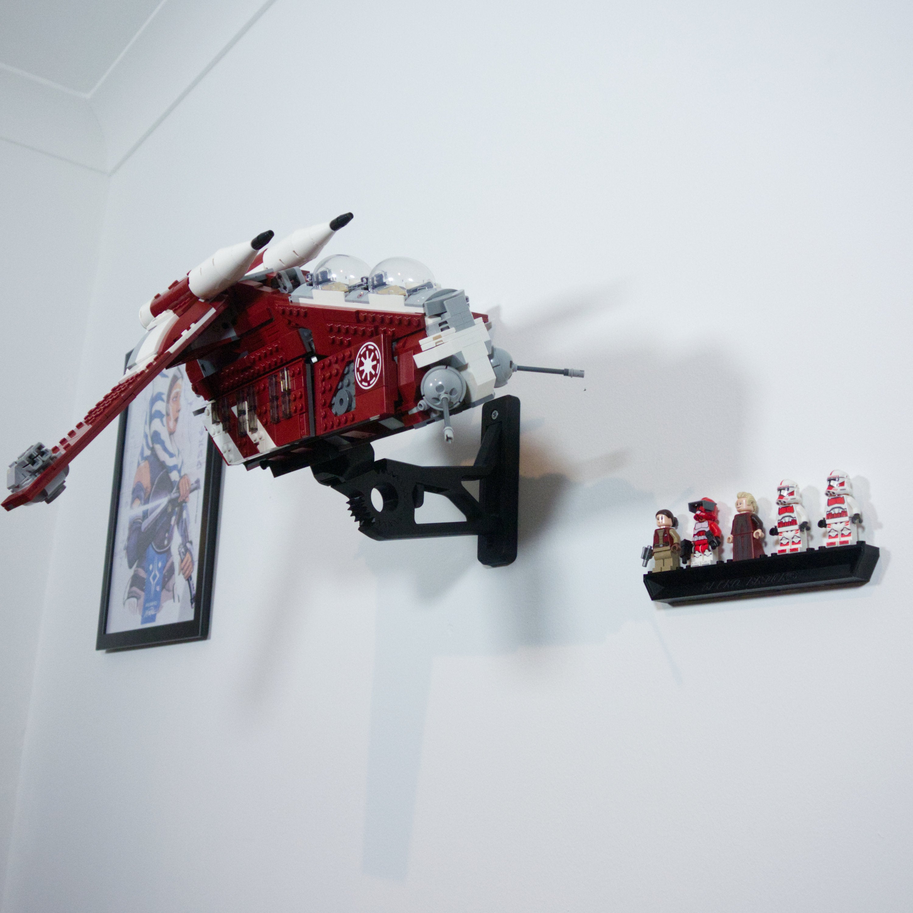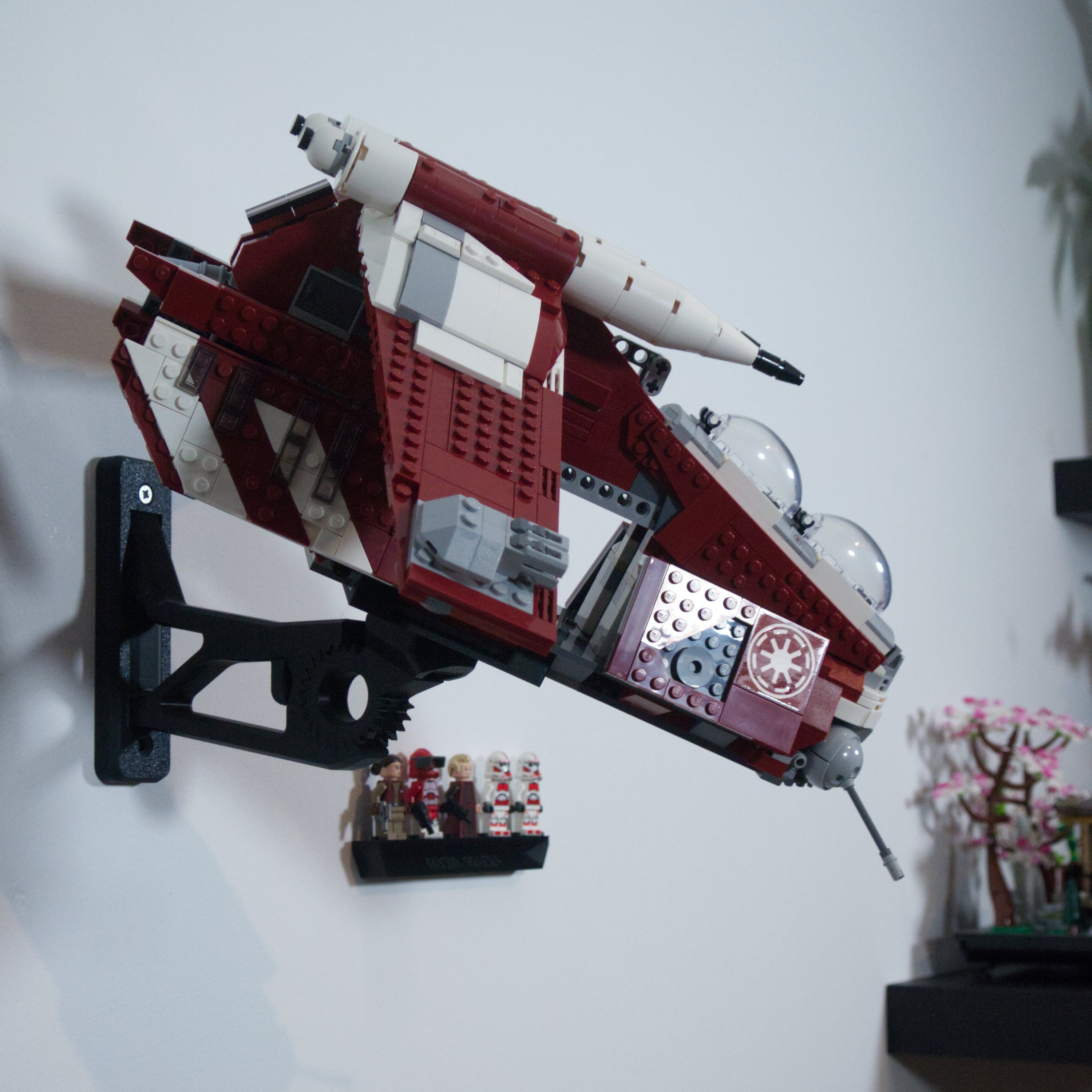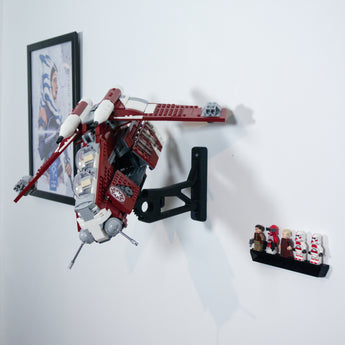 Dette vægbeslag gør det muligt at fremvise din Star Wars Coruscant Guard Gunship i otte forskellige orienteringer. Den diskrete arm støtter sættet sikkert og forbliver skjult bag modellen. Der medfølger desuden en separat holder til minifigurer, som nemt monteres, hvilket sikrer en komplet og organiseret udstilling af din samling.