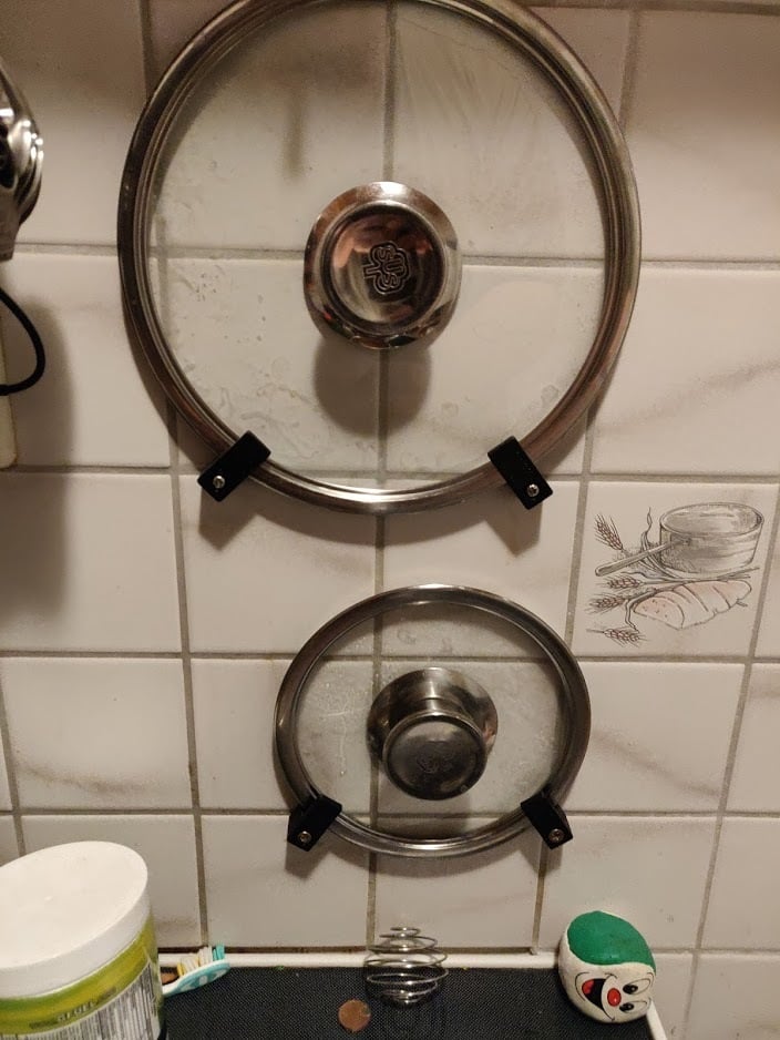 Dessa väggmonterade hållare är utformade för att ge en praktisk förvaringslösning för dina grytlock. Genom att hänga locken på väggen kan du effektivt frigöra värdefullt skåputrymme och hålla ditt kök mer organiserat. Hållarna säkerställer att dina grytlock alltid är inom räckhåll, vilket gör matlagningsprocessen mer effektiv. Deras enkla och funktionella design passar diskret in i de flesta kök och bidrar till en snygg och funktionell arbetsyta.