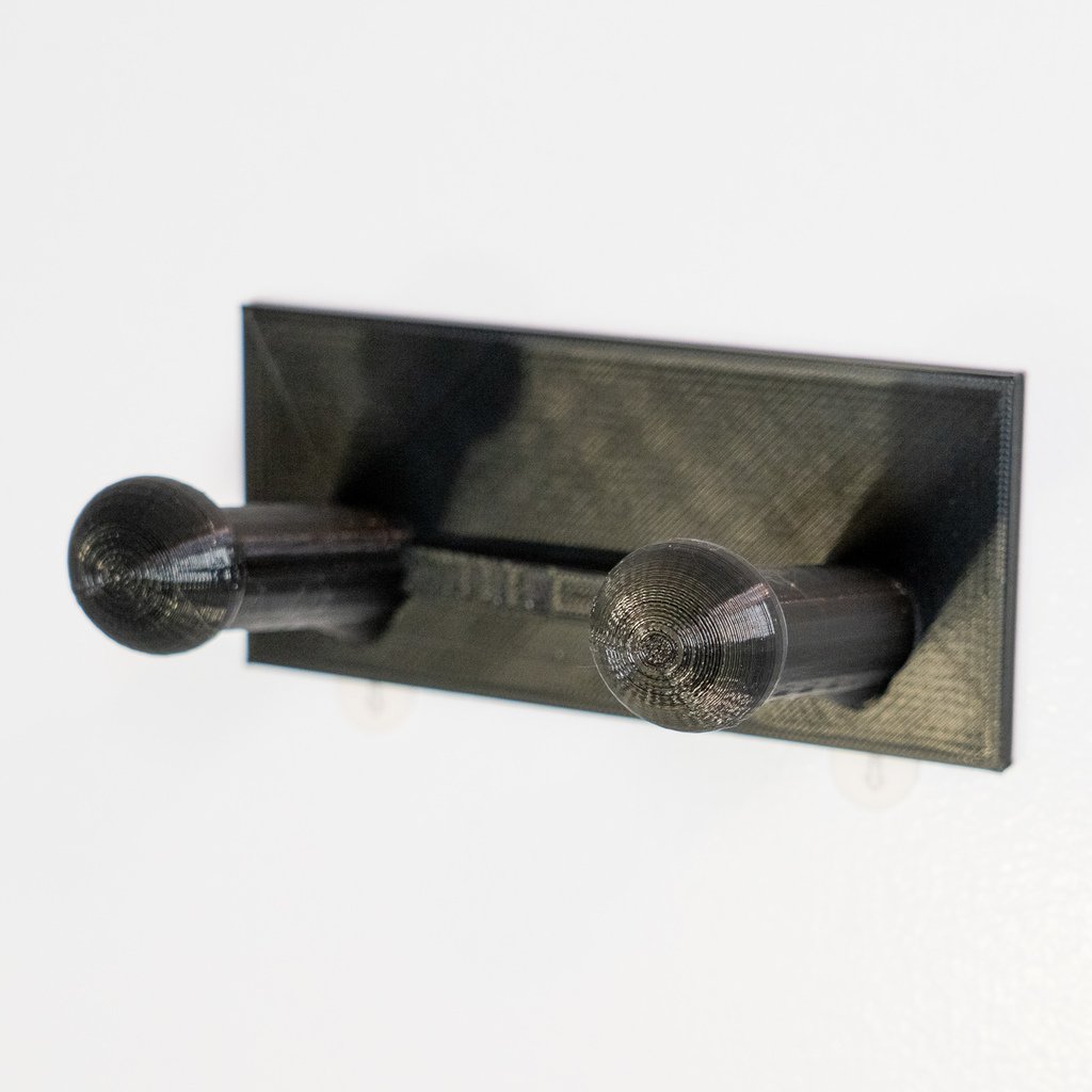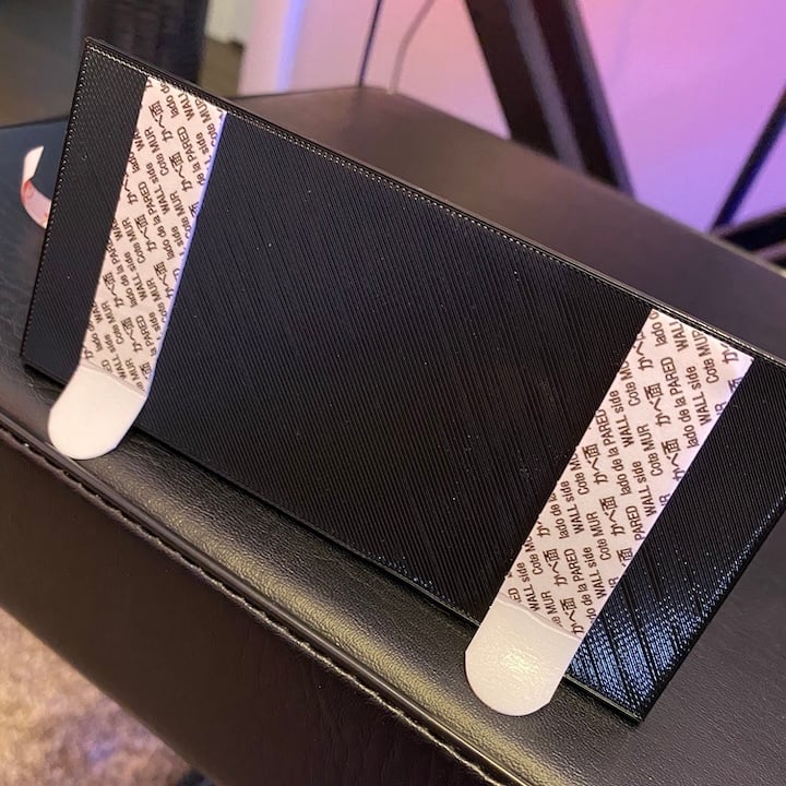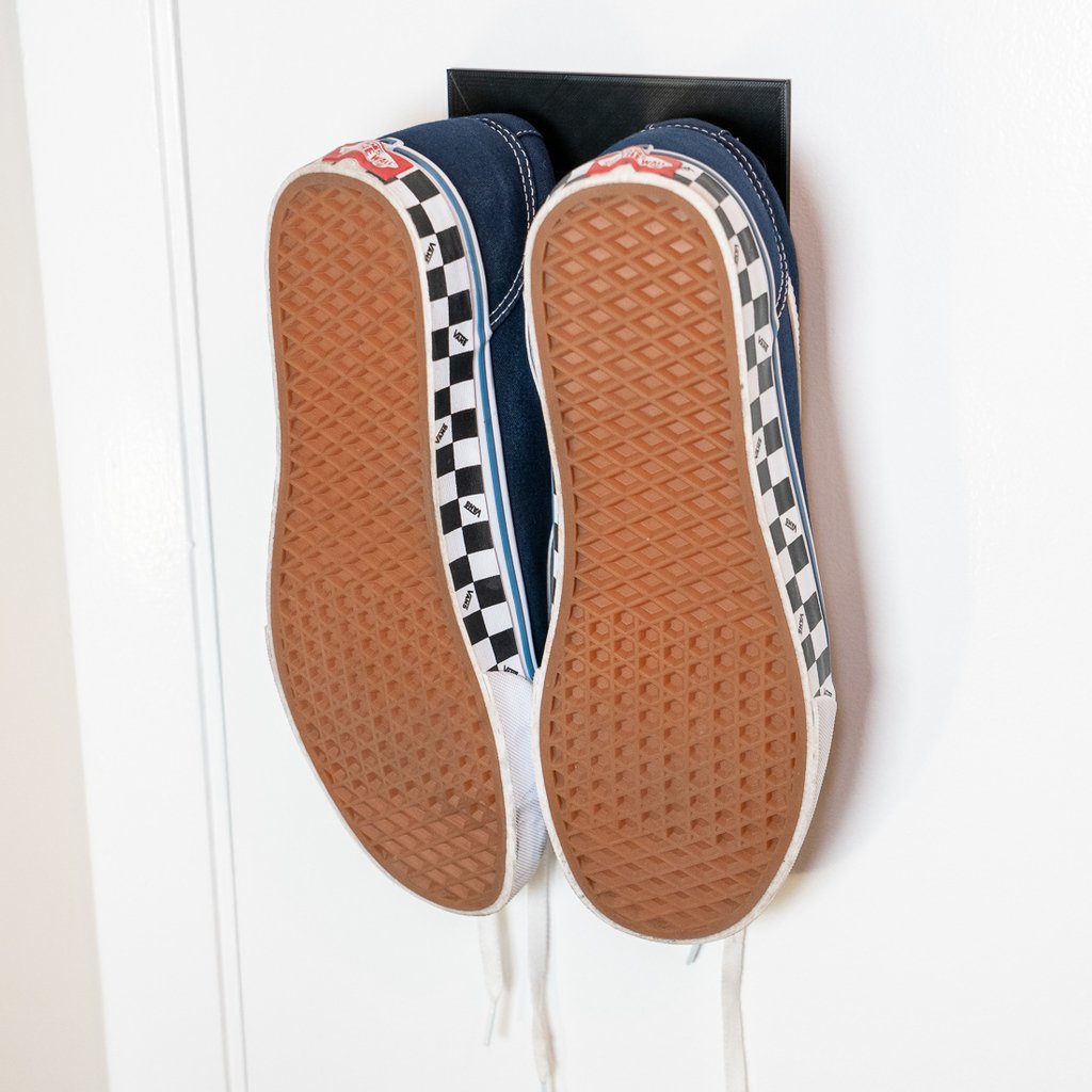 En skohylla för väggen. Skohyllan kan monteras direkt på vägg eller dörr med dubbelhäftande tejp, vilket gör den avtagbar. Den är gjord så att hängaren på de självhäftande tejparna hänger något under skohyllan, så att de kan tas bort vid behov.