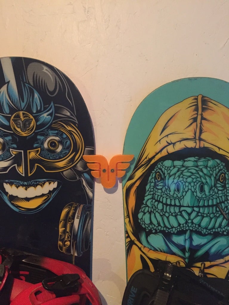 Väggfäste för snowboard från Thrive Snowboards. Två av dessa kan användas för att hänga en snowboard vertikalt på en vägg. Det perfekta sättet att förvara din snowboard, säkert och stilfullt.