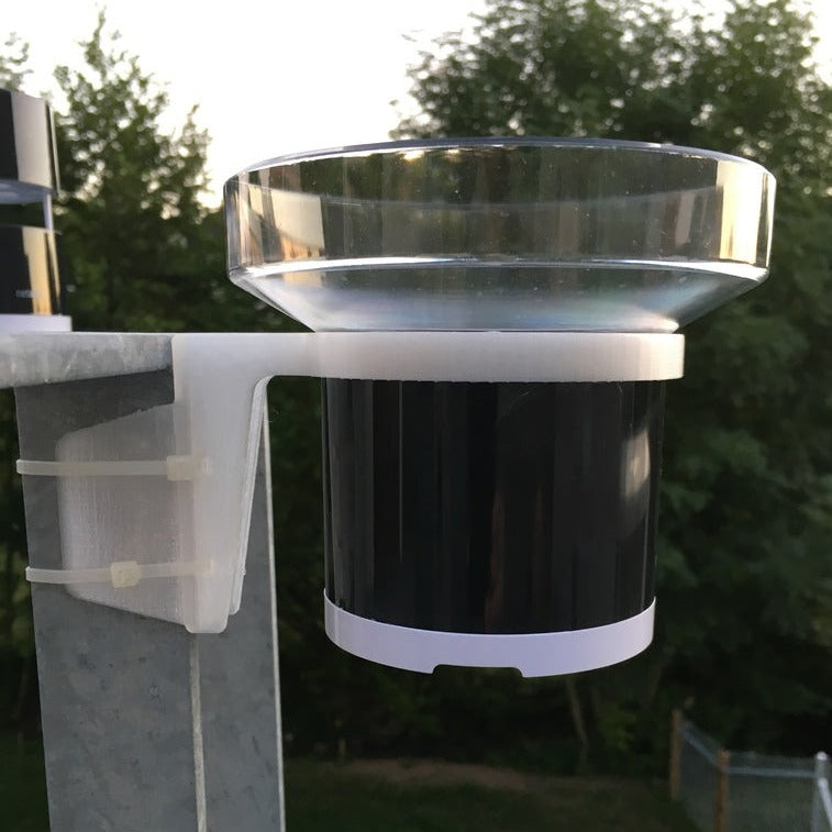 Enkel upphängning för en Netatmo regnmätare, så du säkerställer att den samlar upp allt vatten. Den är designad för en ledstång eftersom den är 41 mm djup och 9 mm bredd.
