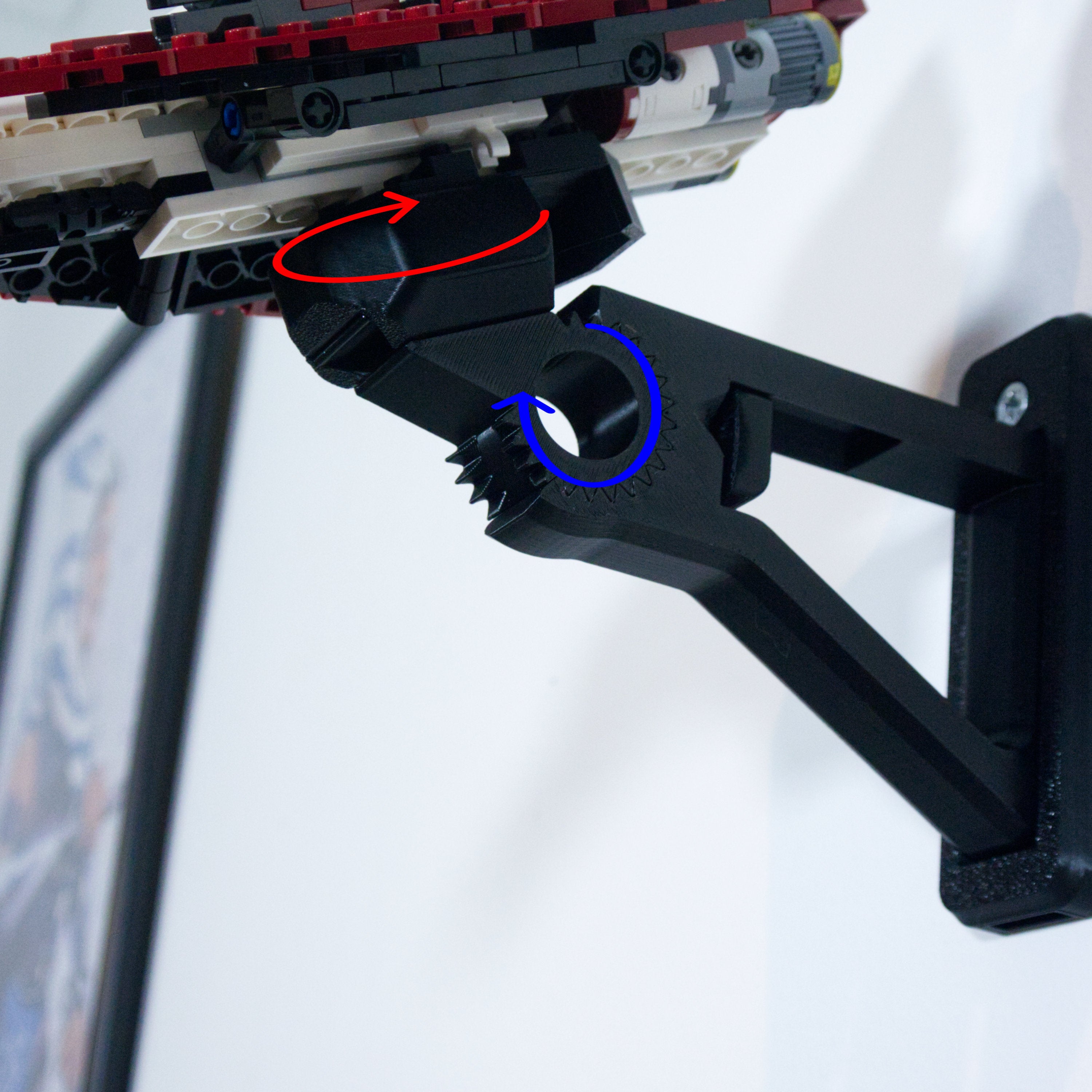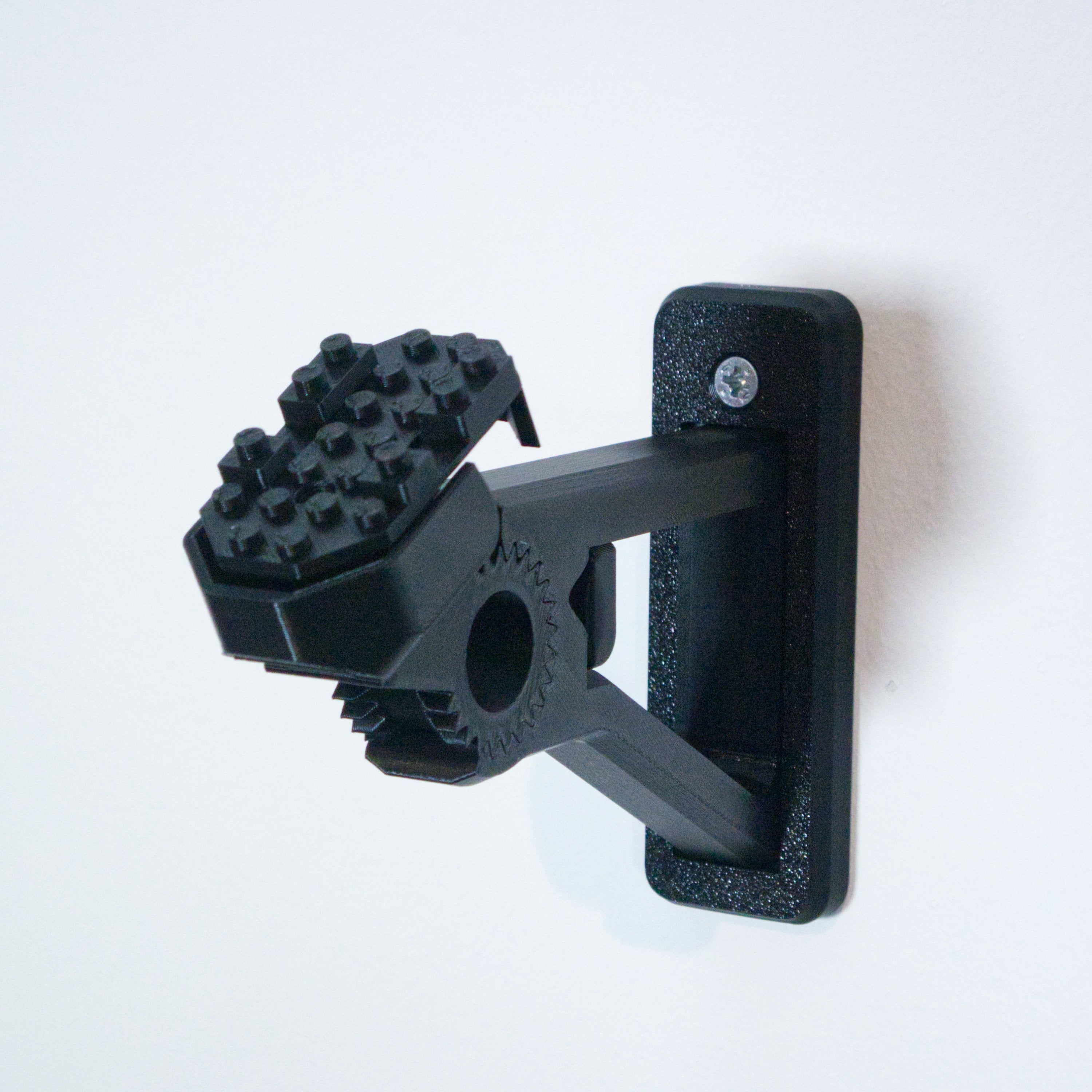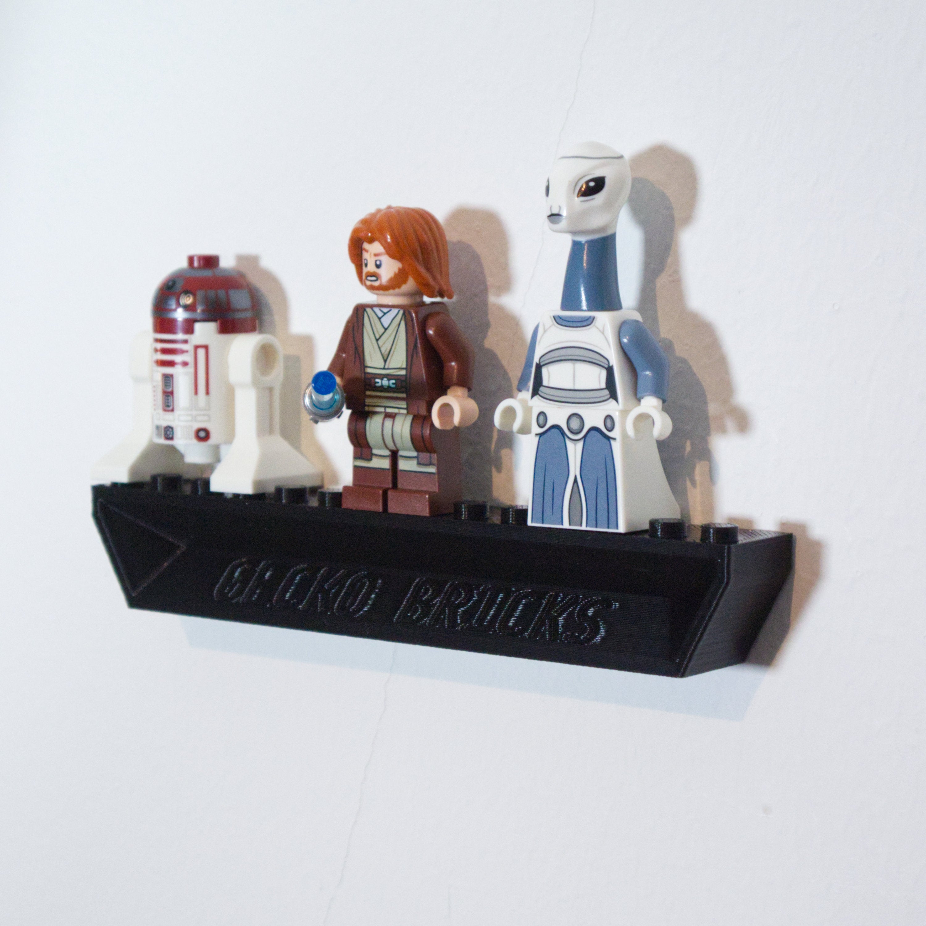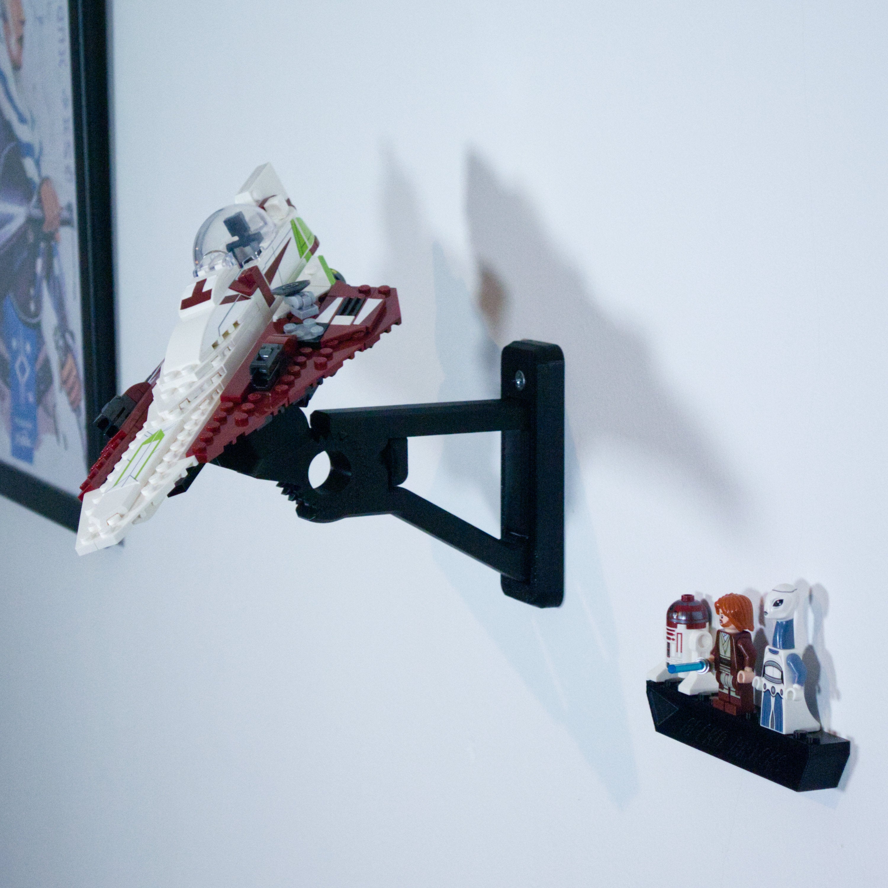 Detta justerbara väggfäste gör det möjligt att visa upp din Star Wars Starfighter i olika vinklar. Fästet är utformat för enkel montering och snabb borttagning av modellen. En separat hållare för minifigurer medföljer, som monteras säkert och skonsamt med en 3M-strip.