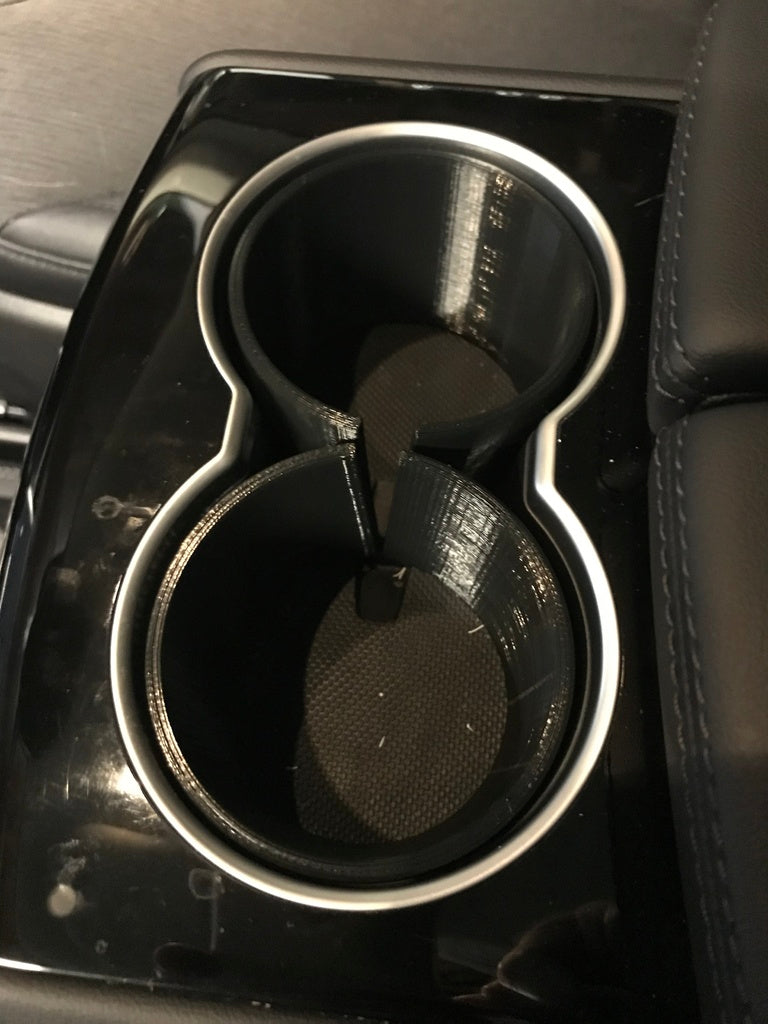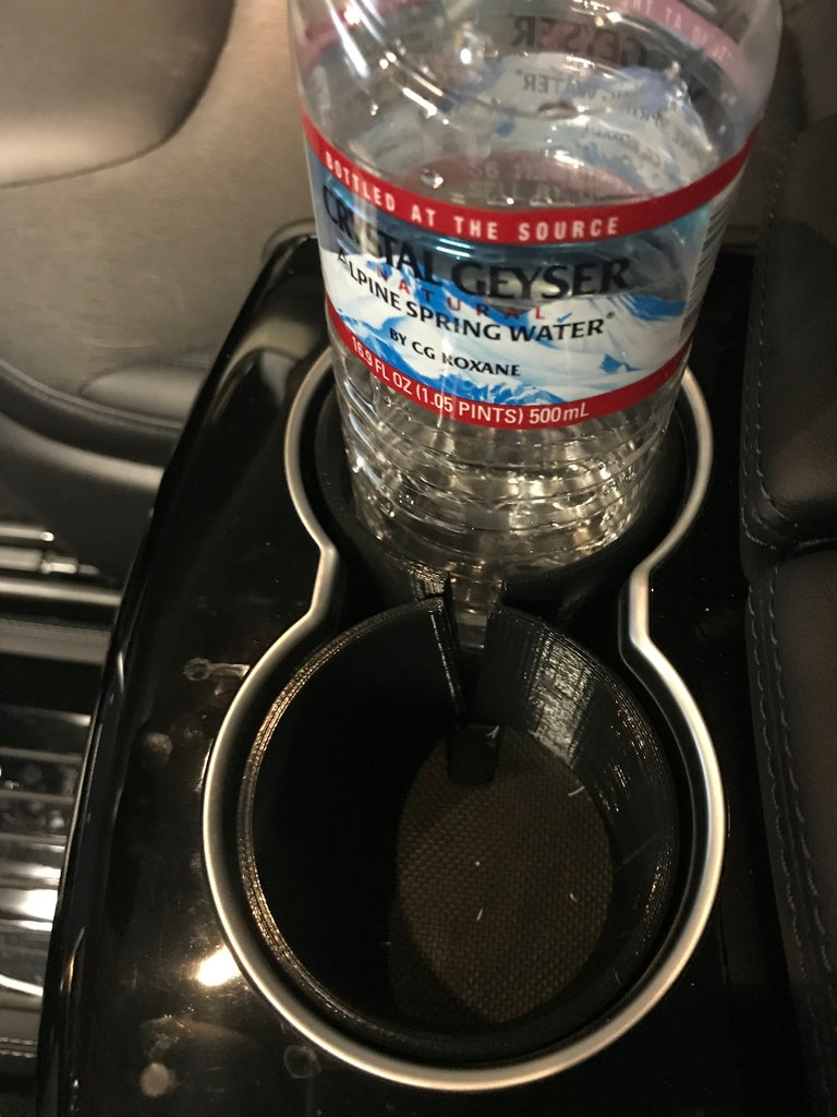 En flaskhållare för Tesla, speciellt utformad för att förhindra att 500 ml vattenflaskor tippar i Teslas mugghållare. Denna flaskhållare passar en mugghållare med en öppning på ca. 79mm i diameter upptill och ett djup på 66mm.