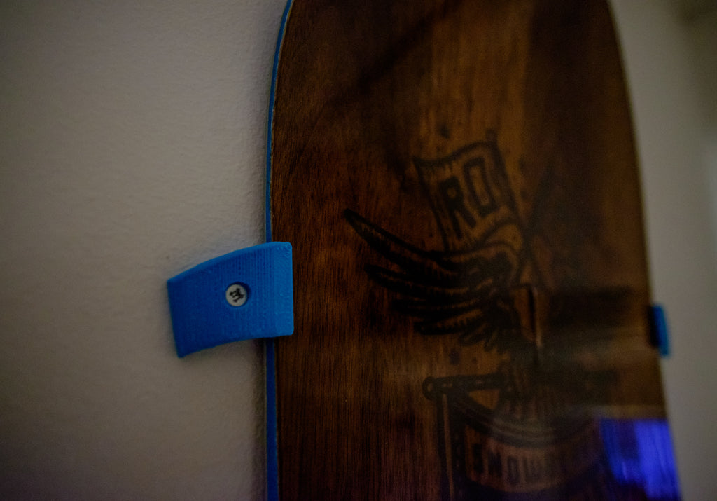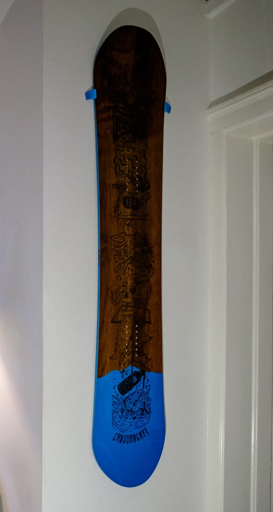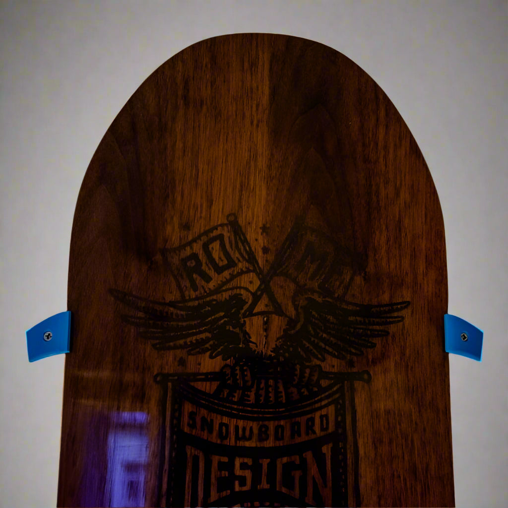 En kollektion av vertikala väggfästen för snowboardbrädor. Finns i två versioner, ett med 2 mm mellanrum till väggen för att förhindra att brädan vidrör och repar den, och ett set utan. 4 mm brett och avsett för träskruvshuvuden med en diameter på 8 mm.